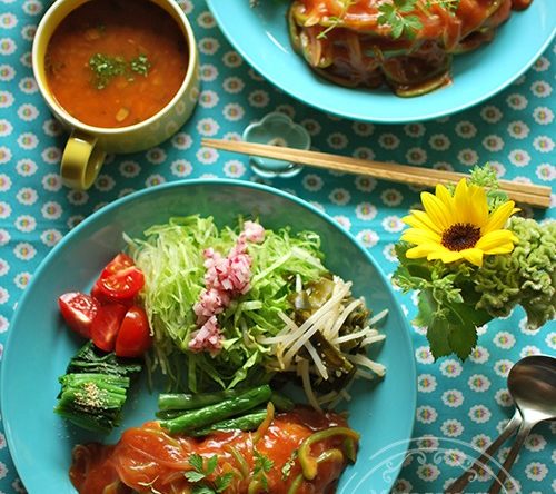 メルマガVol.459のレシピ、できあがりはこんな感じです。 茄子と茗荷は、夏の黄金コンビですね。 その完璧な相棒に、さらになめこを追加しました。 独特の風味と食感を、味噌でまとめます。 茄子の煮込み・・・続きを読む 夏野菜料理のワンプレート。青満喫。