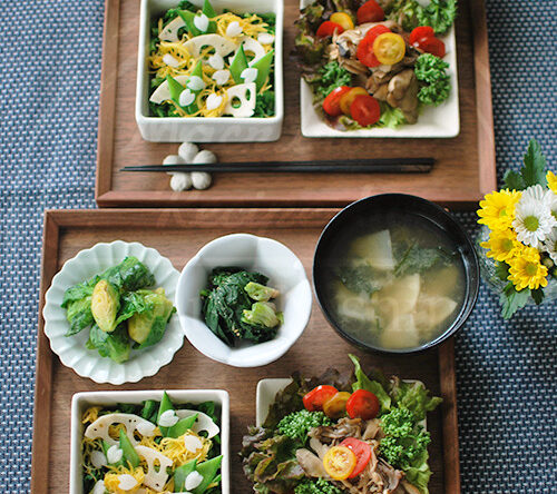一汁七菜。 黄色に緑の野菜を組み合わせて、ハッピーな春の食卓。 二種の「菜の花」。小松菜の菜の花と、いわゆる普通の菜の花。 春から初夏に切り替わる時期は、「これ何の菜の花?」というセリフ・・・続きを読む イキイキワクワクな活性化ワンプレート。