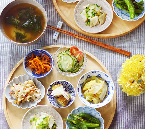 一汁七菜。今日はひょうたん柄の手ぬぐいに合わせて、ブルーとグレーのコーディネート。 今日も夏野菜をたっぷり頂きます。 できるだけ毎日、違う調理法、違う組み合わせにするのがポイント。 時折・・・続きを読む りんどうと砥部焼。