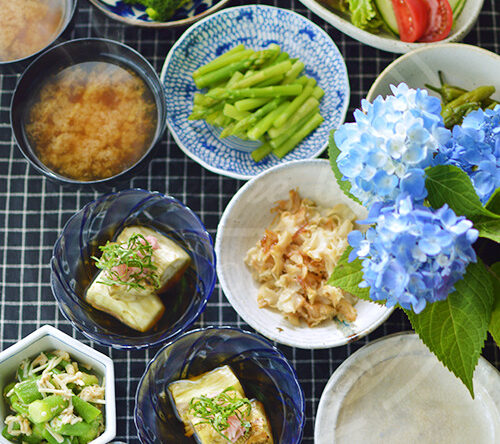 気温も高くなり、いよいよ夏らしくなってきました。 涼やかなガラスの器と、黒いクロスで引き締めます。 茄子が美味しいので、今日は焼き茄子。 大葉と新生姜を添えて、さっぱりとろふわ。 &nb・・・続きを読む 紫陽花と夏野菜の小鉢料理。