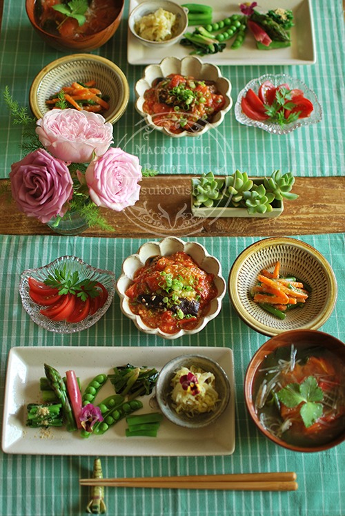 手前の長方形の皿には、旬菜を色々に料理して盛り合わせました。