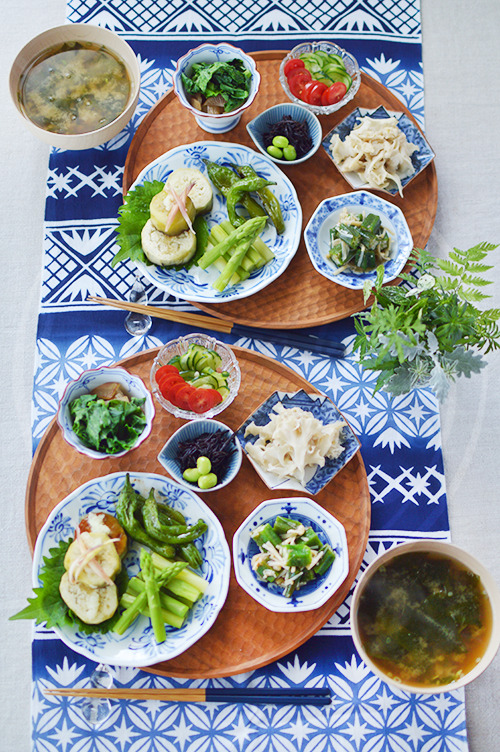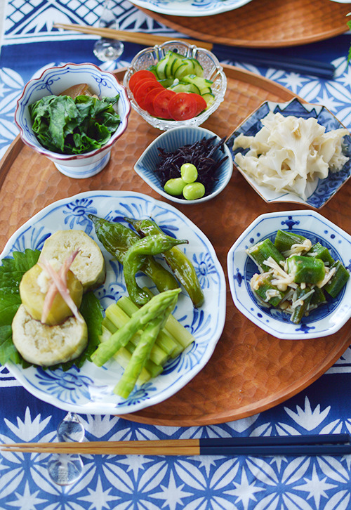 涼しげな手ぬぐいで、爽やかな夏の小鉢料理。